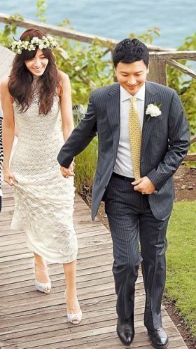 婚礼于今天下午4点至6点举行,场地布置以代表纯洁的白色调为主,除进行仪式的白色帐棚草地区,还有另两区如茵绿草可供来宾轻松跳舞、聊天;稍晚则提供丰盛的海鲜BBQ自助餐宴飨宾客。
